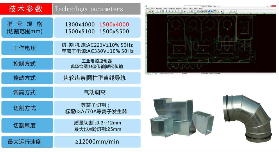 特別針對(duì)通風(fēng)管道行業(yè)專門用于切割2mm以下的薄、中碳鋼板、 不銹鋼板、鋁板、銅板、鍍鋅板、白鐵皮、合金板等多種板材材料,快速風(fēng)管等離子切割機(jī),效果佳、無(wú)掛渣和毛刺;在使用時(shí)直接連接普通配置的臺(tái)式電腦,運(yùn)用文泰軟件或AutoCAD繪圖軟件直接用于繪制圖形,不需轉(zhuǎn)換,直接切割,并可進(jìn)行簡(jiǎn)單的排料,工件共邊設(shè)置,購(gòu)買本公司此款設(shè)備可享受免費(fèi)送貨上門、安裝調(diào)試及培訓(xùn)、包教包會(huì)!